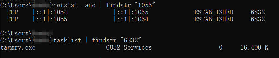 定位到一个叫tagsrv.exe的应用使用了此端口,进程PID为6823。