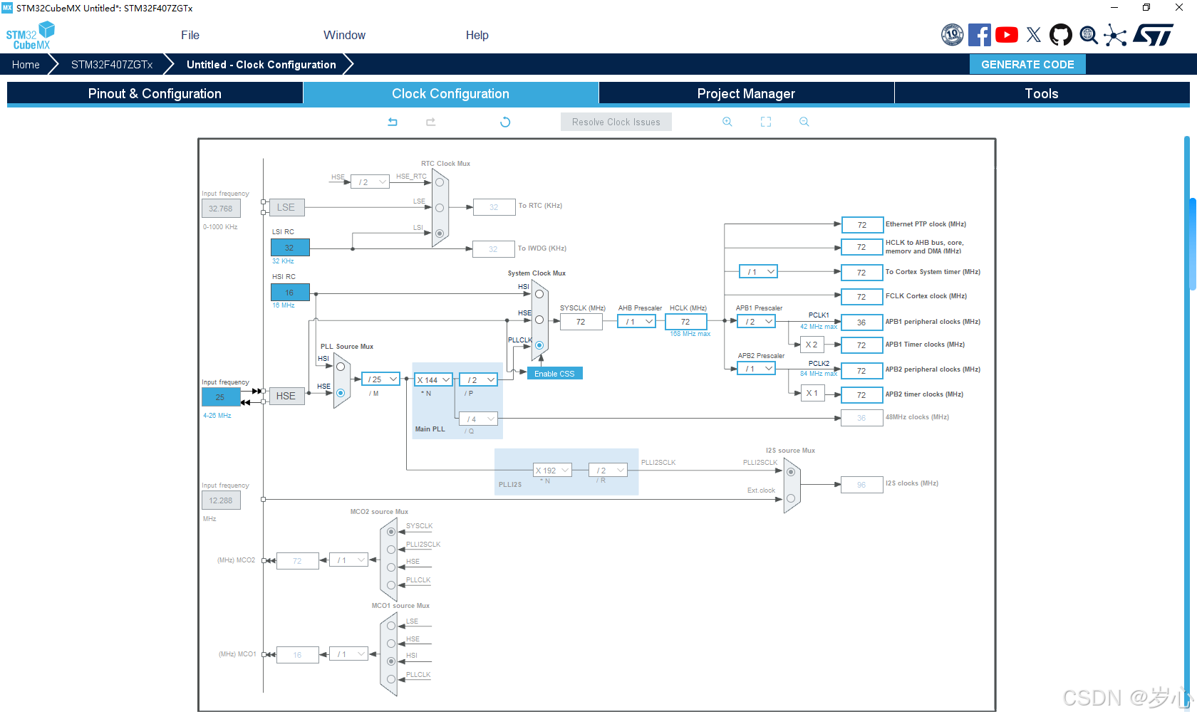 这里考虑到大部分朋友用的是F1系列,主频我设置为了72MHz