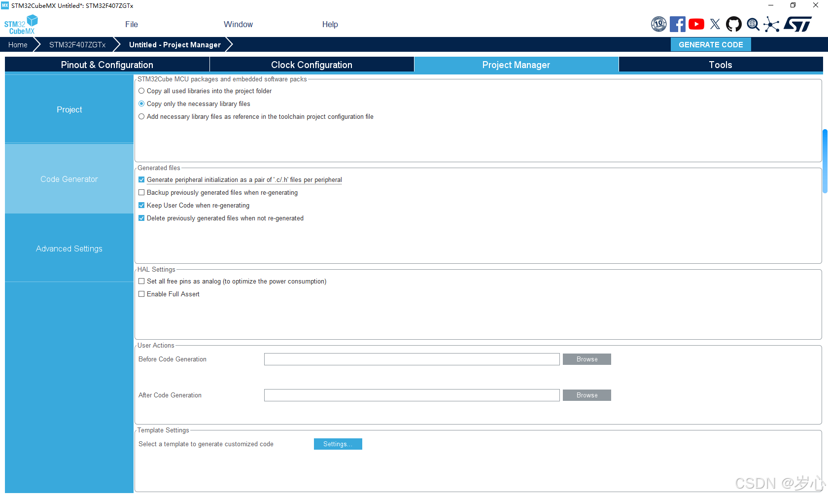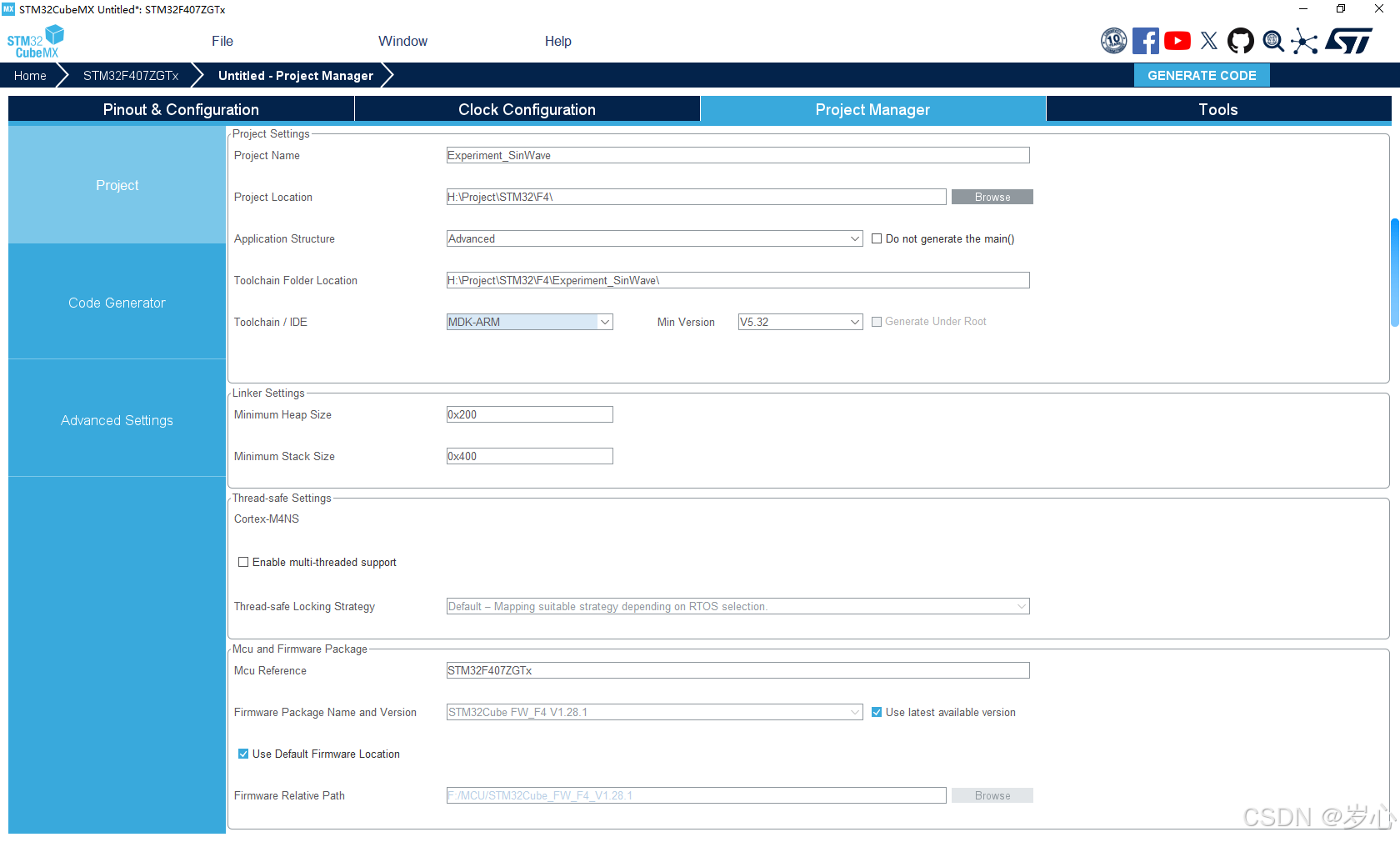 设置完成后点击右上角GENERATE CODE生成代码,在弹出的对话框中点击Open Project打开项目。