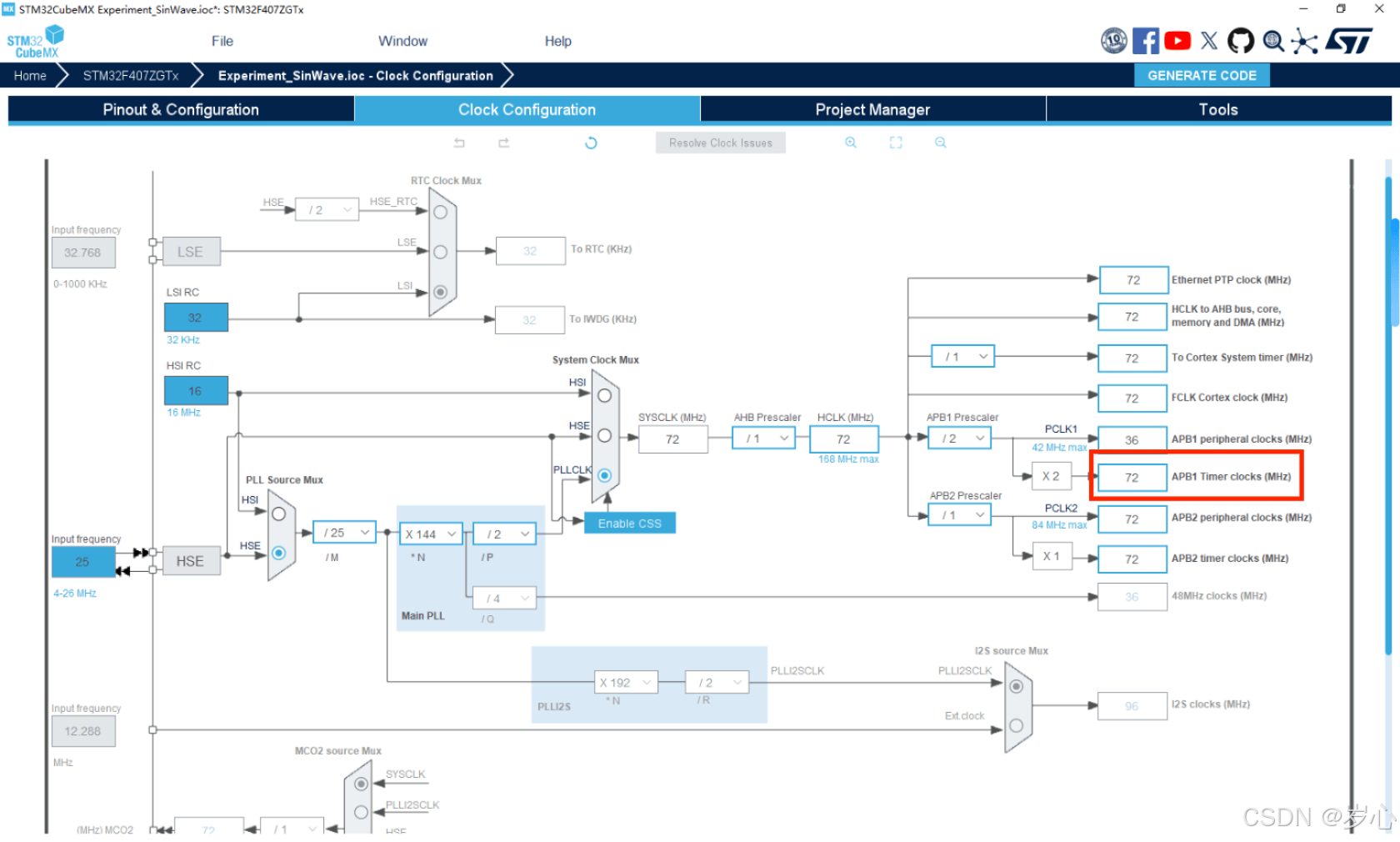 再看一下时钟树,可以发现定时器的频率是72
