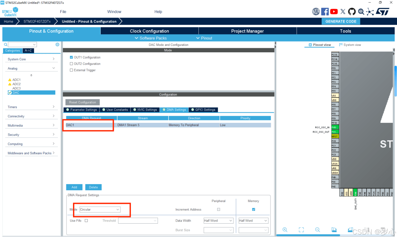 实验平台:STM32F407ZGT6(所有带DAC的MCU都类似)