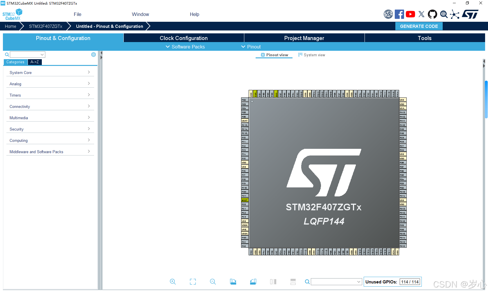 在STM32CubeMX中新建一个项目,选择你的MCU,进入配置界面