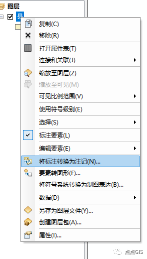 接下来右键点击图层,选择标注转注记(转出注记的目标地址要在数据库中,建议要素类(当前操作被标注的图层)与注记放置同一个数据库下,最好是个人地理数据库,便于管理、使用。)
