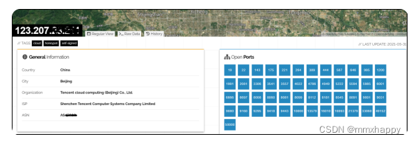 随便点击一个IP地址进入链接页面,即可看到关于这个IP地址的详细信息,右侧展示的为对外开放的全部端口号,如图4.4所示。