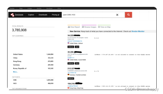 根据以往课程中学习到的知识,大家都知道:数据库端口通常不需要在互联网开放,数据库端口也完全可以改成非标准端口,以及仅允许必要的。强大的搜索功能可以帮助安全从业者对互联网平台进行安全审计,但如果被互联网上不怀好意者利用,也可成为他们搜集信息伺机攻击的。以其强大的搜索引擎可以发现海量的网站信息以及安全漏洞,但是首先应该做好网站自身的安全防范,如:配置严格的安全策略、部署。扫描,也保证其获得的信息是非常