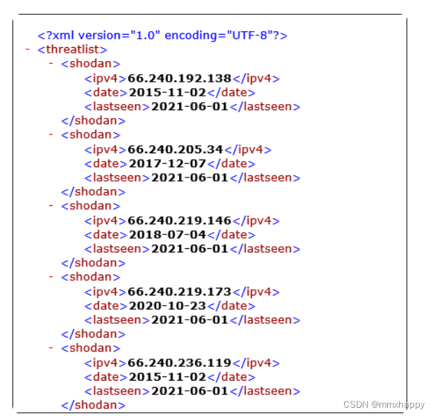 国内外的一些威胁情报平台定期会更新Shodan扫描器的地址,比如ISC SANS威胁情报平台,提供的Shodan扫描器IP地址信息,截选的部分截图,如图4.7所示。