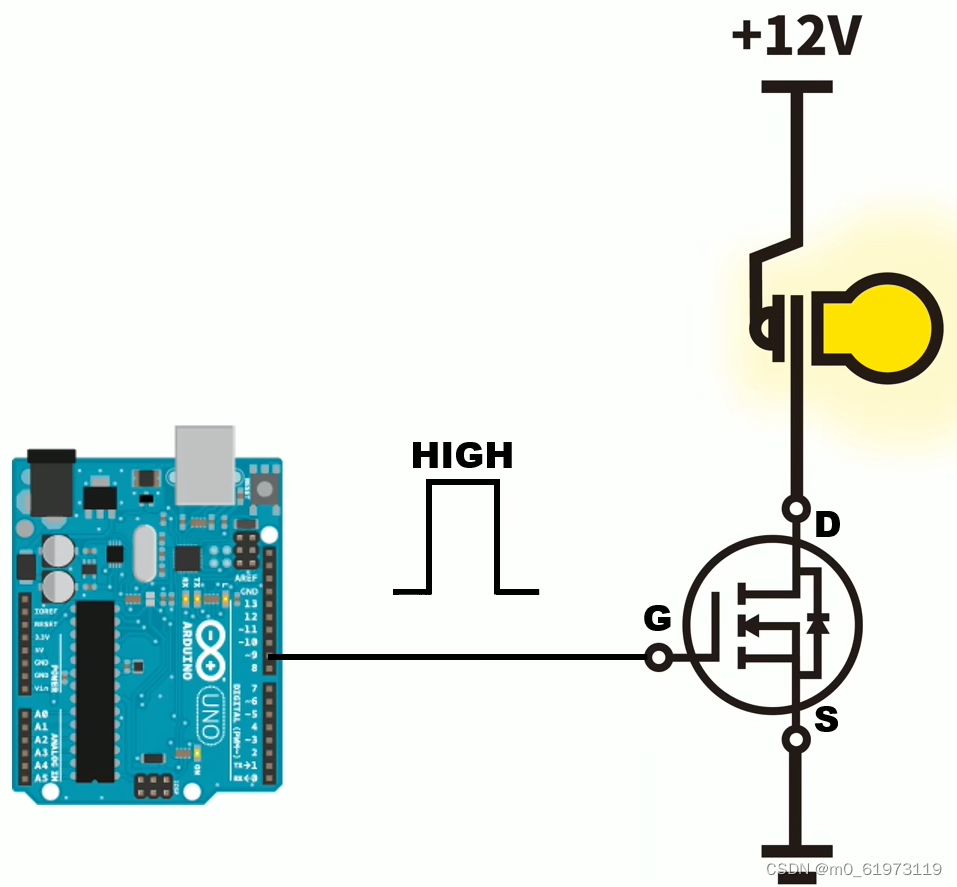 单片机的某一个引脚通过输入高低电平来控制一个功率器件的打开,比如如图显示,当往g端输入一个高电平,那么nmos管导通,从而灯泡点亮。其实质就是当nmos管关闭时,内部的电阻无穷大,nmos管导通时,内部电阻接近于0