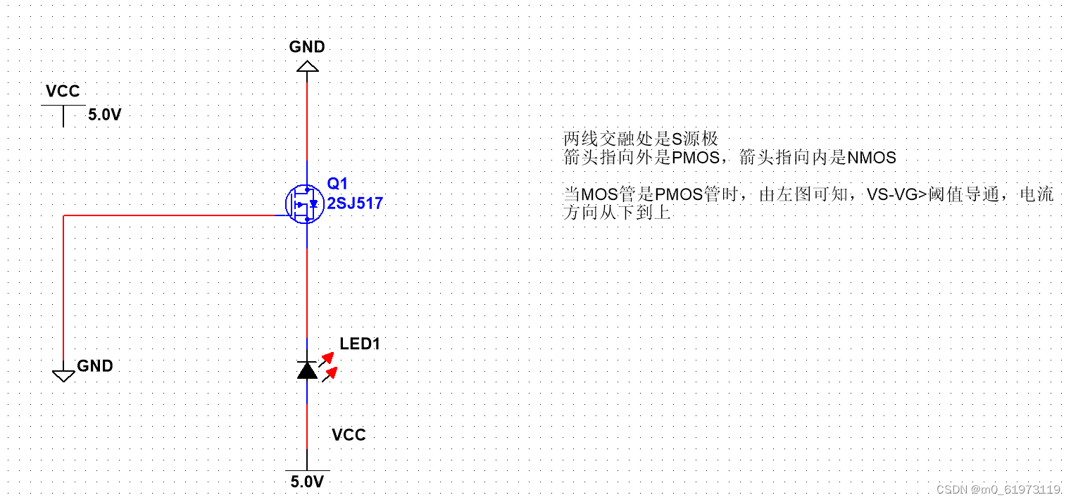 - PMOS的特性,Vsg大于一定的值就会导通,适合用于源极接VCC时的情况(高端驱动)
