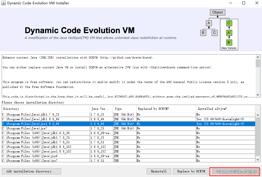 需要在jdk和jre上同时安装补丁,点击右下角按钮:Install DCEVM as altjvm,然后关闭界面即可。
