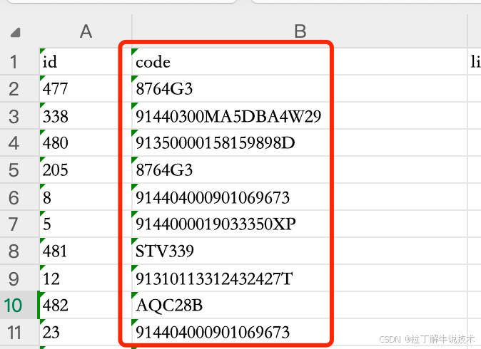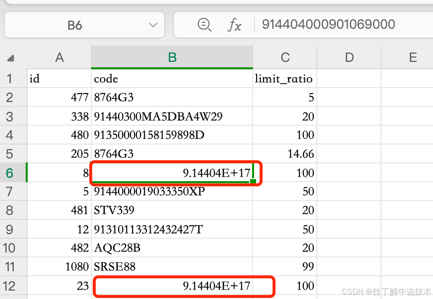 比如code字段是18位的数值字符串,我们想要直接导出文本格式,正常展示。然而导出后在csv里就变成了9.14404E+17这种看似乱码,实际是科学计数法表达的内容,看起来很不自然。原因Excel打开csv文件后,如果列值内容都是数字,默认字段类型是数值。此外,Excel在展示数值内容时如果内容>12位,它会自动转化为科学计数法去展示表达。此外,比如产品代码是标准的6位数字【004417】,但是c