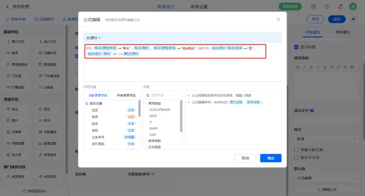 【总课时】字段,默认值选择公式编辑,如图设置公式;