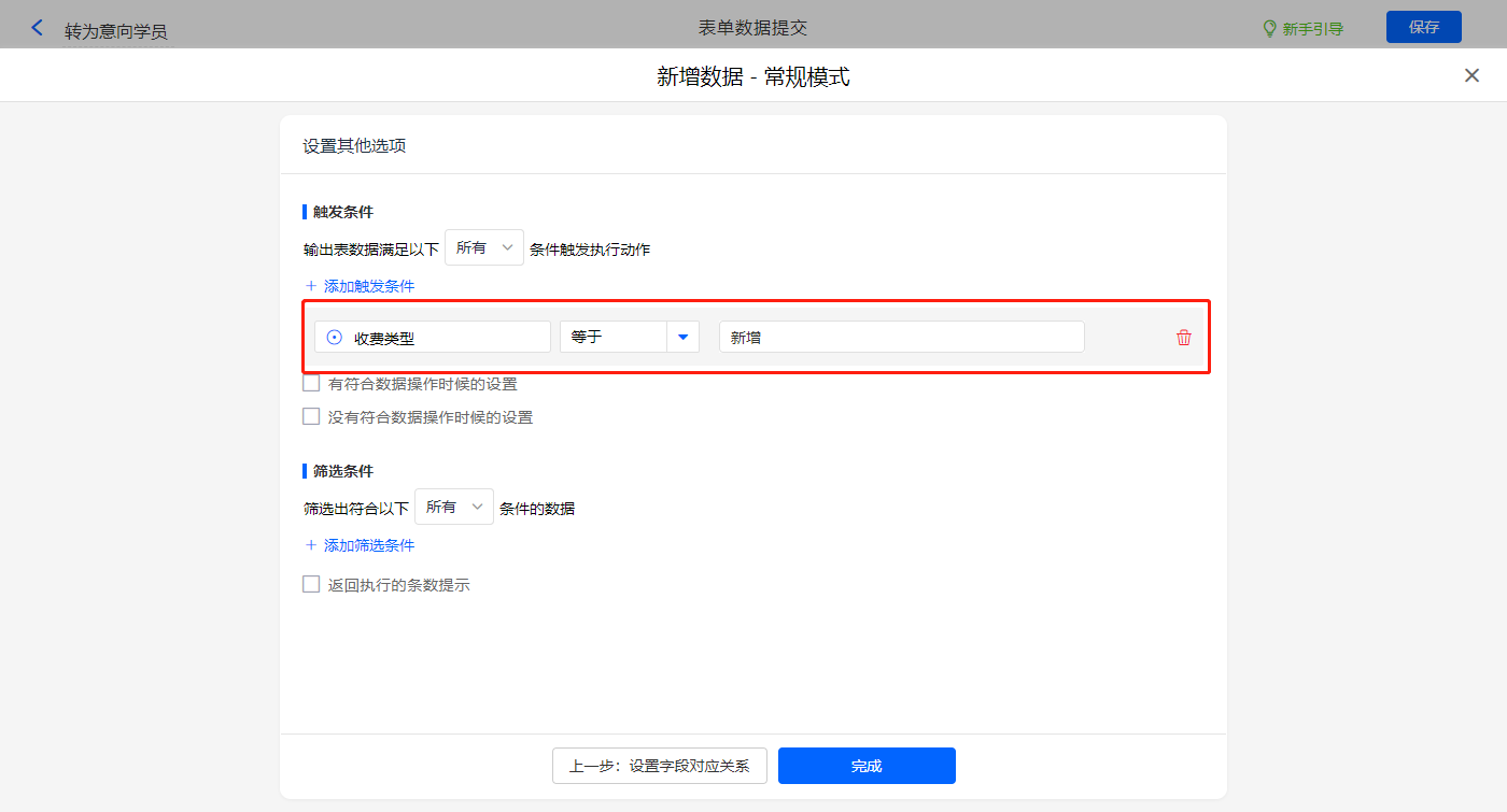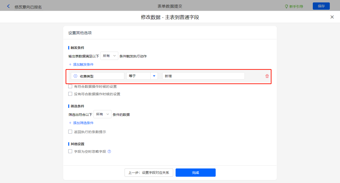 其他设置触发条件为【收费类型】等于新增,设置好点击【完成】并保存该数据助手;