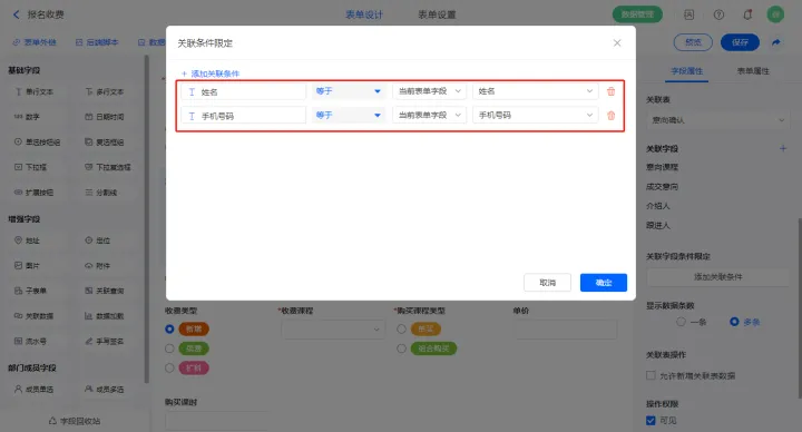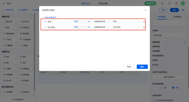 设置关联条件,【姓名】、【手机号码】、【学员】字段作为关联条件;