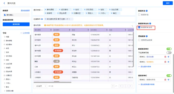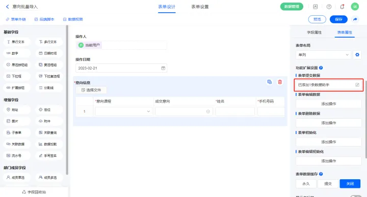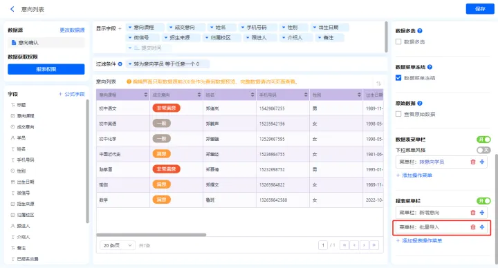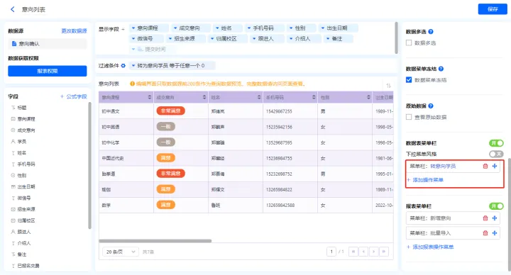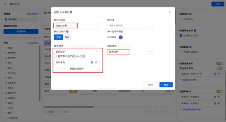【转为意向学员】的菜单栏,操作模式设置为数据助手;