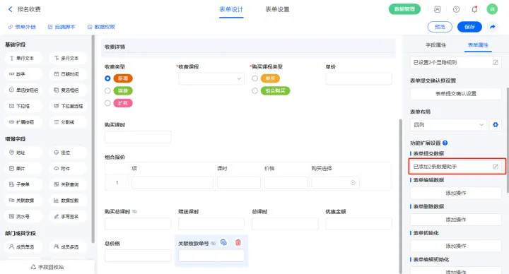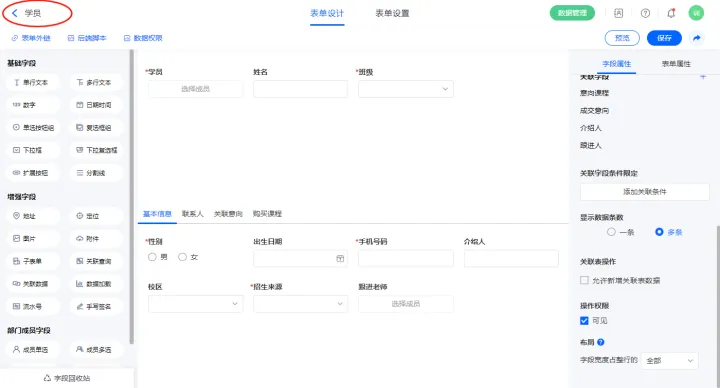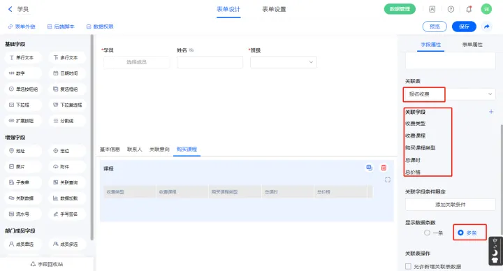 【课程】字段,设置关联表为【报名收费】并如图选择关联字段,设置显示数据条数为多条;