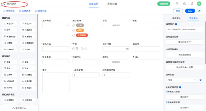 1)新增【意向信息站】报表,用基础报表【数据表】展示数据源为表单【意向确认】的数据;