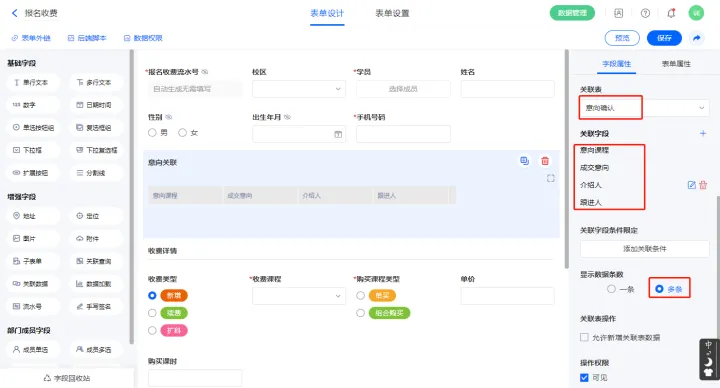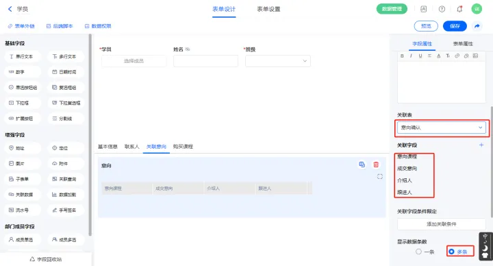 2)【意向关联】字段,设置关联表为【报名收费】并如图选择关联字段,设置显示数据条数为多条;