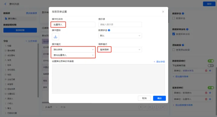 【批量导入】的报表菜单,操作模式设置为弹出表单【意向批量导入】;