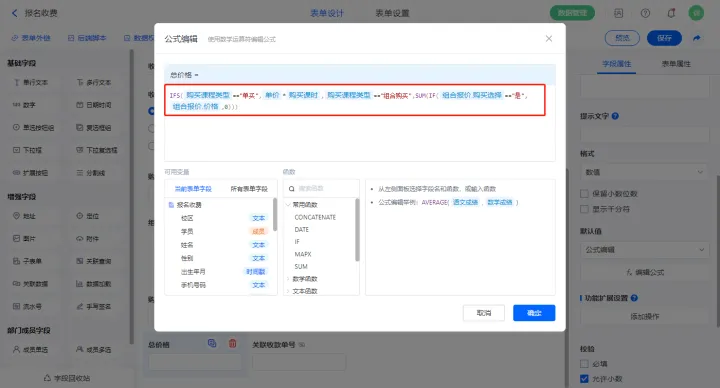 【总价格】字段,默认值选择公式编辑,如图设置公式;