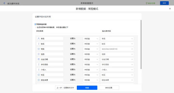 新增新增数据的执行动作,选择目标表单【意向确认】,选择对应赋值字段,置好点击【完成】并保存该数据助手;