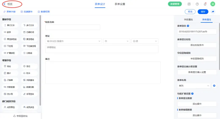 【报名收费】的菜单栏,操作模式设置为弹出表单【报名收费】;