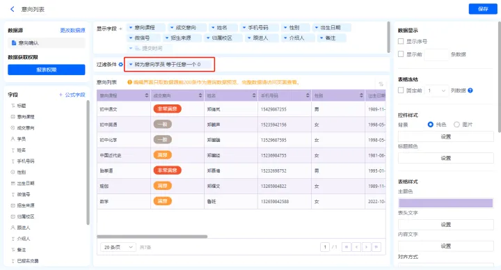 1)新增【意向学员】报表,用基础报表【数据表】展示数据源为表单【意向确认】的数据;