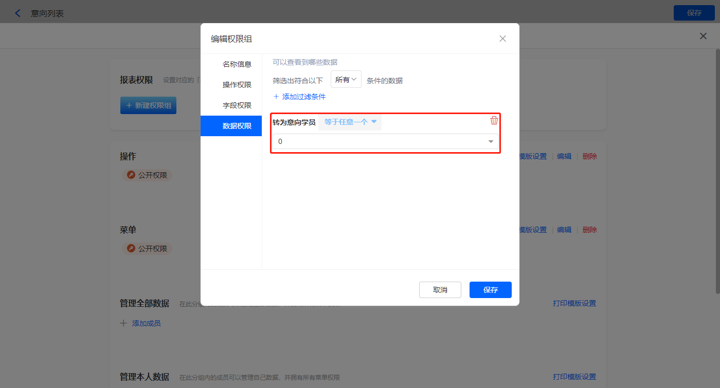 数据权限添加过滤条件,【转为意向学员】等于“0”;