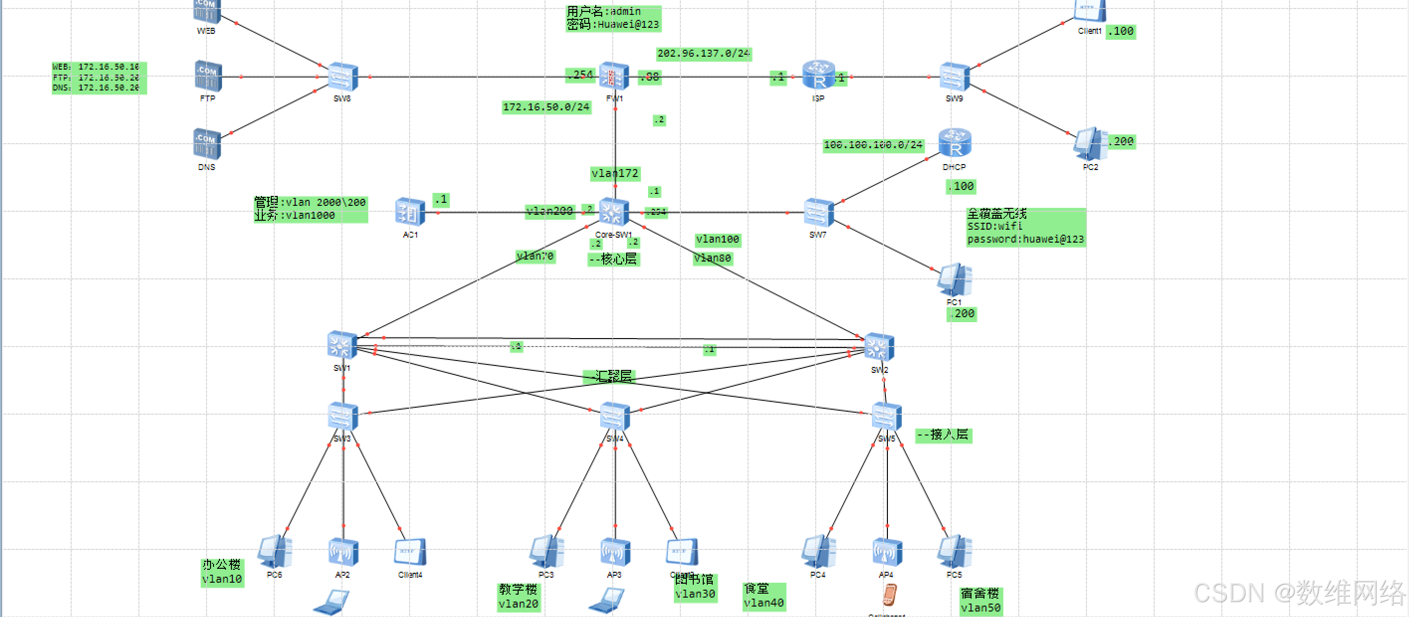 - 学校内部实现无线全覆盖,保障内部终端设备可以无线接入并上网。