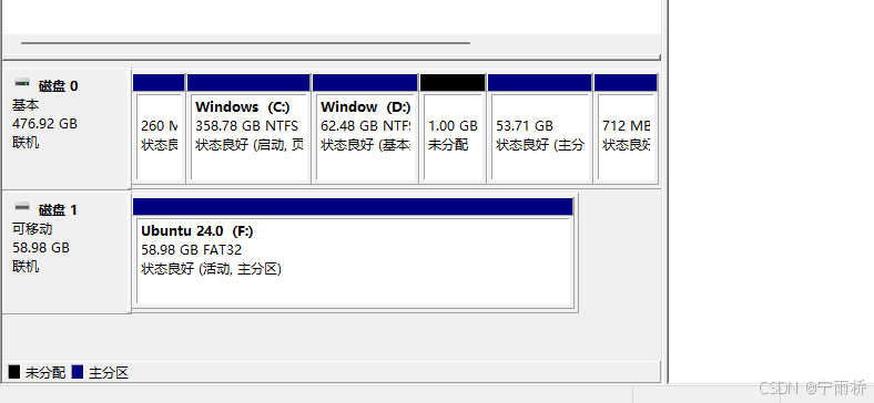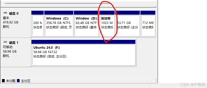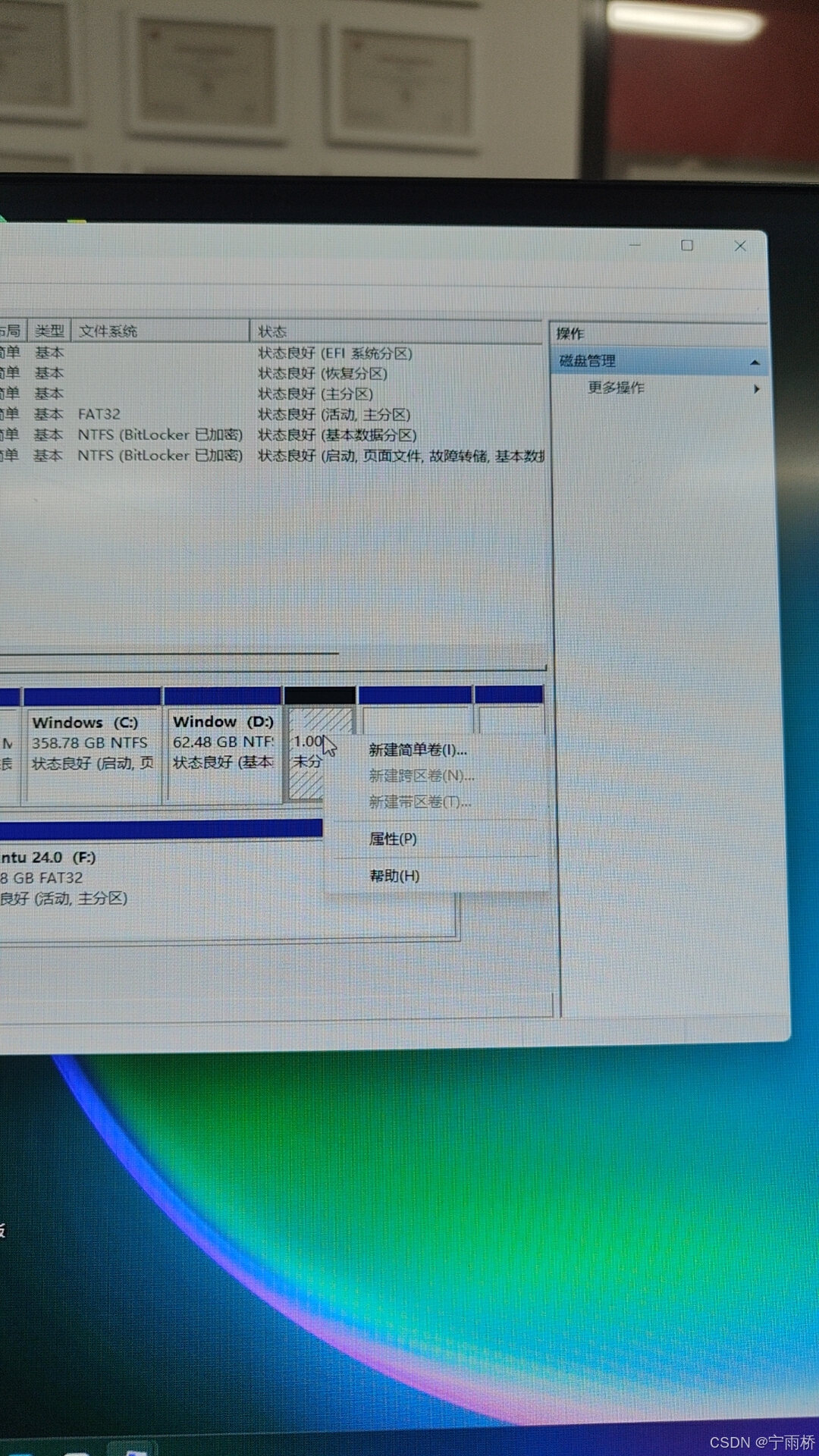 压缩成功后大家可以看到我这里有1个G的空间未被分配,对于这个空间呢,大家就可以进行自己操作了,(我后期会出一个双系统的安装教程,如果你是为了装双系统而看的我这边篇那么到这里你就可以停止了,装双系统的话建议多分一点空间,根据自己的需求去分)