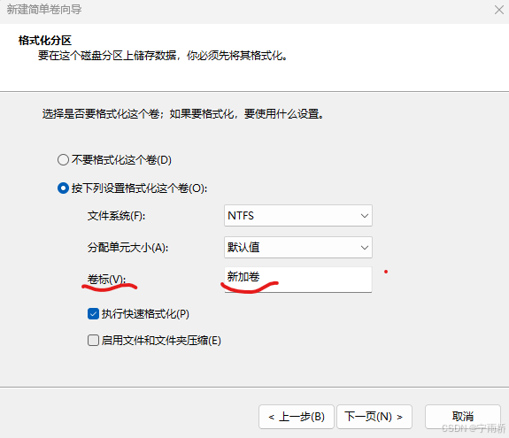 到了这里你可以继续选择下一步,也可以选择改变卷标,即你的磁盘名(无特殊需要不要轻易去改动其他的选项,默认即可)