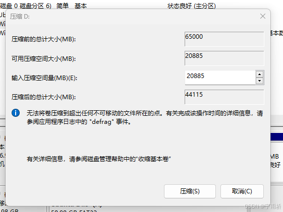 “可用压缩空间”,这个就是压缩完你个盘还有多少空间能够使用(总的 — 用掉的),这个默认情况下是和第三个“输入压缩空间量”是一致的,这个呢就是你要压缩出来的空间,对这块空间你可以选择自己给他分一个盘