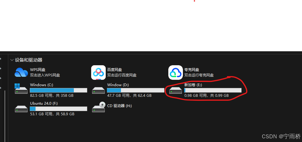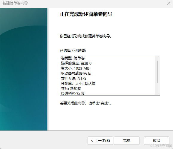 这样我们就创建好了一个E盘(上一步操作我没修改卷标,所以显示的默认的)