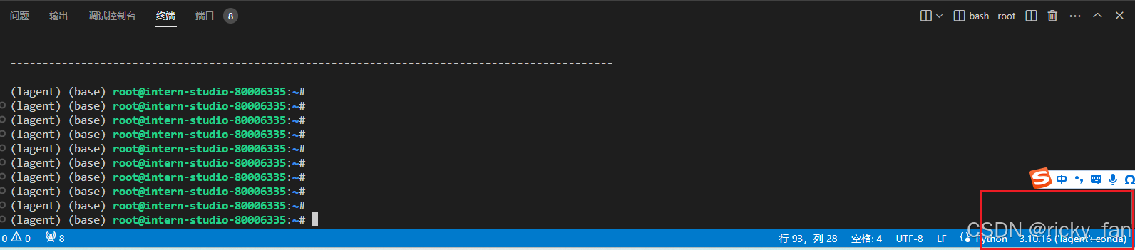 之前还是一个正常的环境名,是我正常在终端通过conda activate lagent 显示的。但是后面我又手动点了vscode右下角的python环境,点完之后就有2个环境名称了。如下图这里: