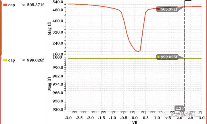 下图为处理后的sp仿真结果,黄色曲线为理想电容,接近1pF,其中误差值来源于固定频率的值使用了近似数,红色曲线为MOS电容的电压-电容曲线。