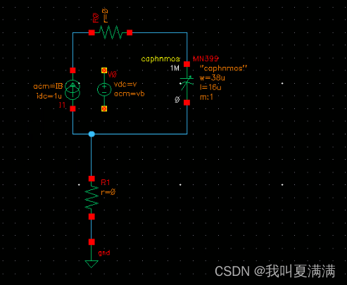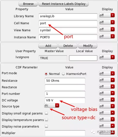 S参数的仿真电路图如上所示,需要利用analogLib库中的port器件,并设置其source type参数为dc,DC voltage设置为变量「VB」。