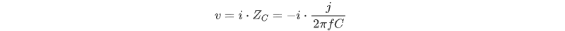 假设在电容两端施加频率为 f 的小信号电压 v ,电容上流过的小信号电流为 i ,那么三者有如下关系: