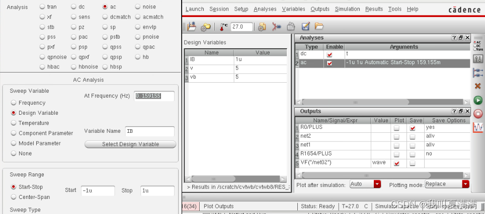 按照上面内容设置完port源之后,在ADE L中选择sp仿真,在Ports一栏选择原理图中的port器件,然后在固定频率下扫描电容的偏压「VB」,其中频率固定为 f=12π.