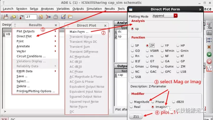 仿真结束之后,在ADE L窗口,通过选择:Results->Direct Plot->Main Form,然后在对话框中按照下图所示选择仿真结果。