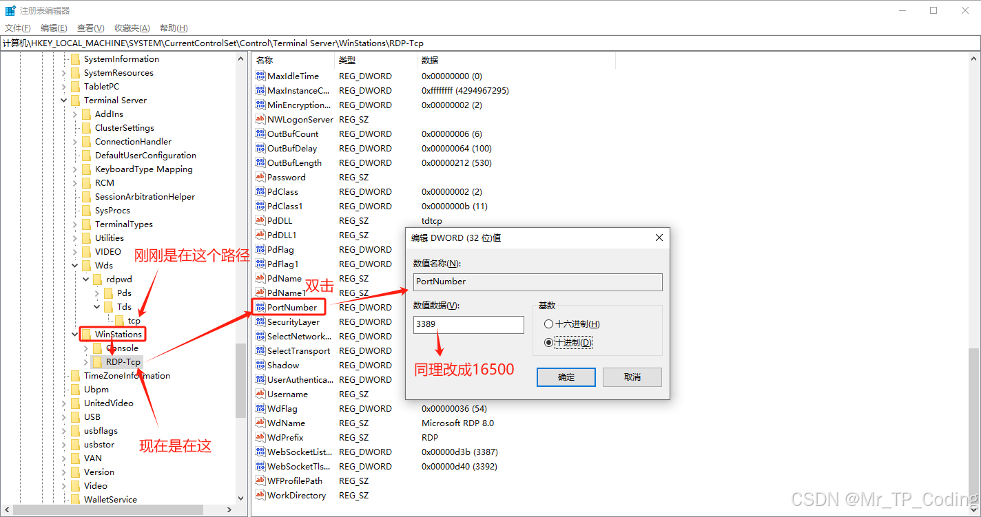 路径:计算机\HKEY_LOCAL_MACHINE\SYSTEM\CurrentControlSet\Control\Terminal Server\Wds\rdpwd\Tds\tcp