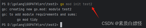 首先在当前的目录中初始化(该演示项目为test2,在终端中 输入go mod init '当前的项目名'),初始化结束后,会发现在项目中多了一个go.mod文件
