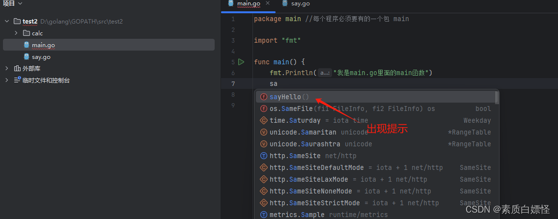这个时候 在main.go中的main函数可以直接调用同级目录say.go中的sayHello函数。输入同级代码时会出现提示