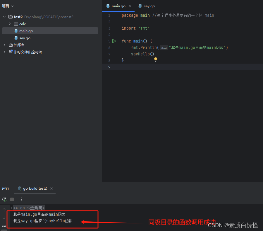 二、创建一个主函数main.go(每一个项目中都必须有一个main包),say.go(用于展示同级目录),calc文件夹,且calc文件夹内创建一个calc.go(用于展示不同级目录)
