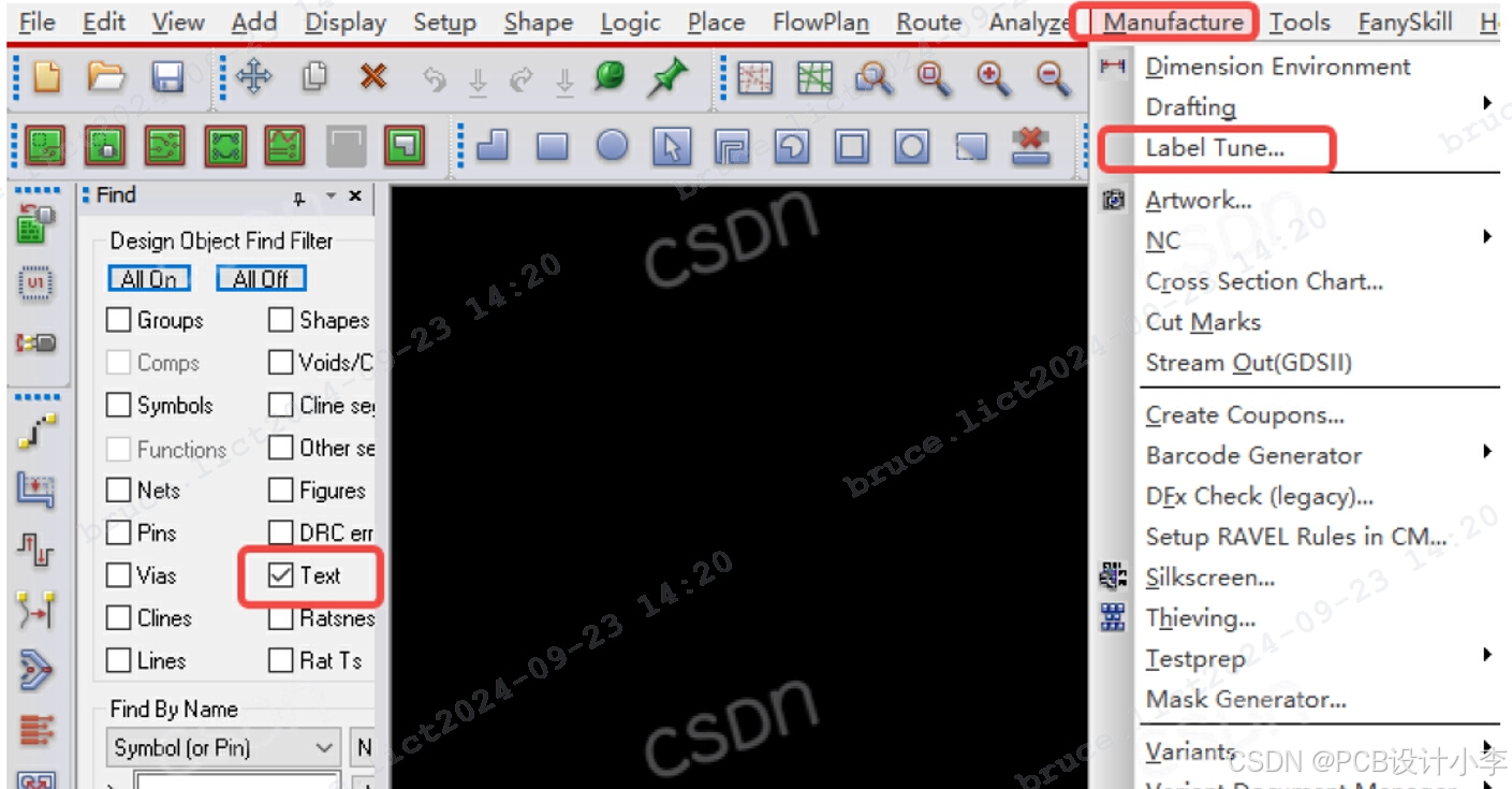 3、在Find 栏勾选 “Text”, 菜单栏 点击 Manufacture ,下拉栏中选中 “Label Tune”