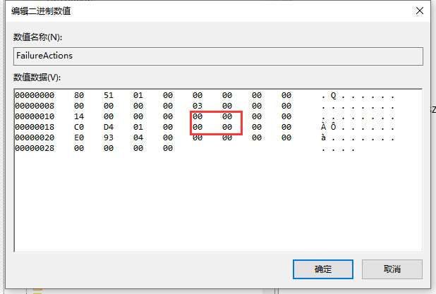4、继续在右侧找到 “FailureActions” 键,右键点击修改该键的二进制数据,将 “0010”、“0018” 行的左起第5个数值由原来的 “01” 改为 “00”,完成后,点击下方的 “确定” 即可。