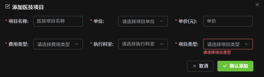 { required: true, message: '请输入医技项目名称', trigger: 'blur' },//类型为输入框时,触发校验的时机应该是blur:失去焦点