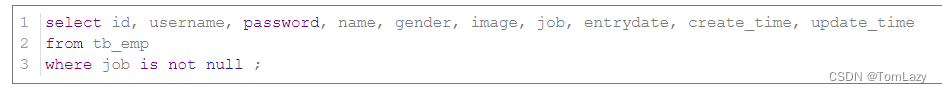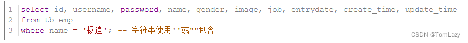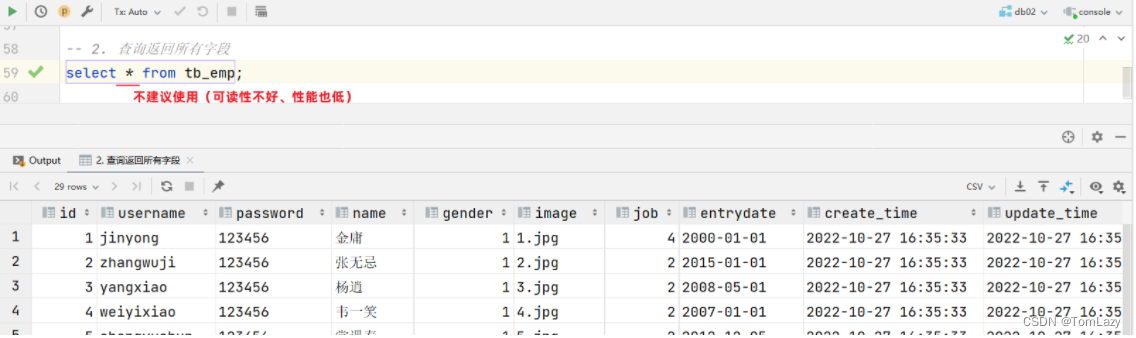 【提示】:`*`号代表查询所有字段,在实际开发中尽量少用(不直观、影响效率)