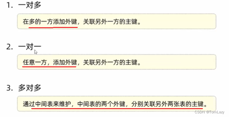一对一关系表在实际开发中应用起来比较简单,通常是用来做单表的拆分,也就是将一张大表拆分成两张小表,将大表中的一些基础字段放在一张表当中,将其他的字段放在另外一张表当中,以此来提高数据的操作效率