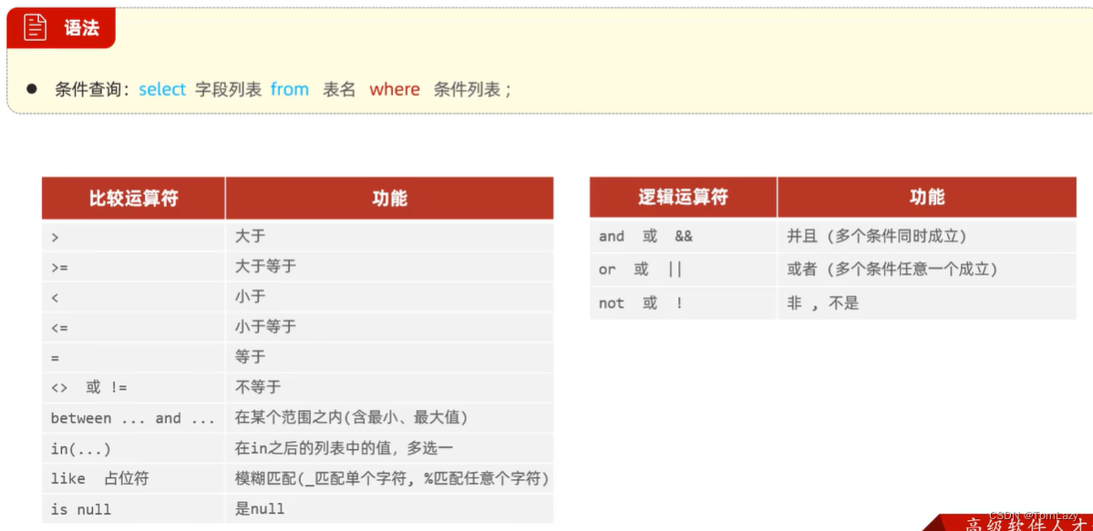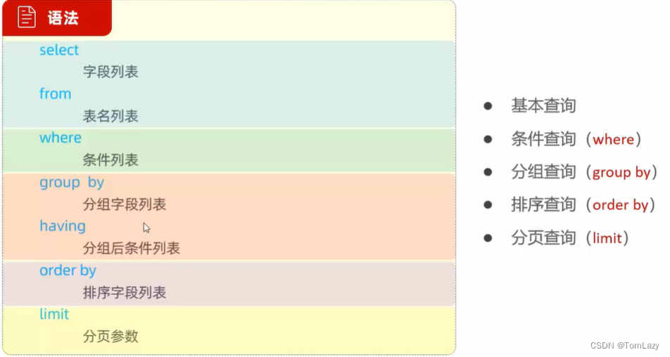 查询操作是所有SQL语句当中最为常见,也是最为重要的操作。在一个正常的业务系统中,查询操作的使用频次是要远高于增删改操作的。当我们打开某个网站或APP所看到的展示信息,都是通过从数据库中查询得到的,而在这个查询过程中,还会涉及到条件、排序、分页等操作。