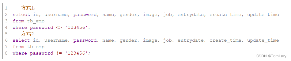 案例5:查询 密码不等于 '123456' 的员工信息 |