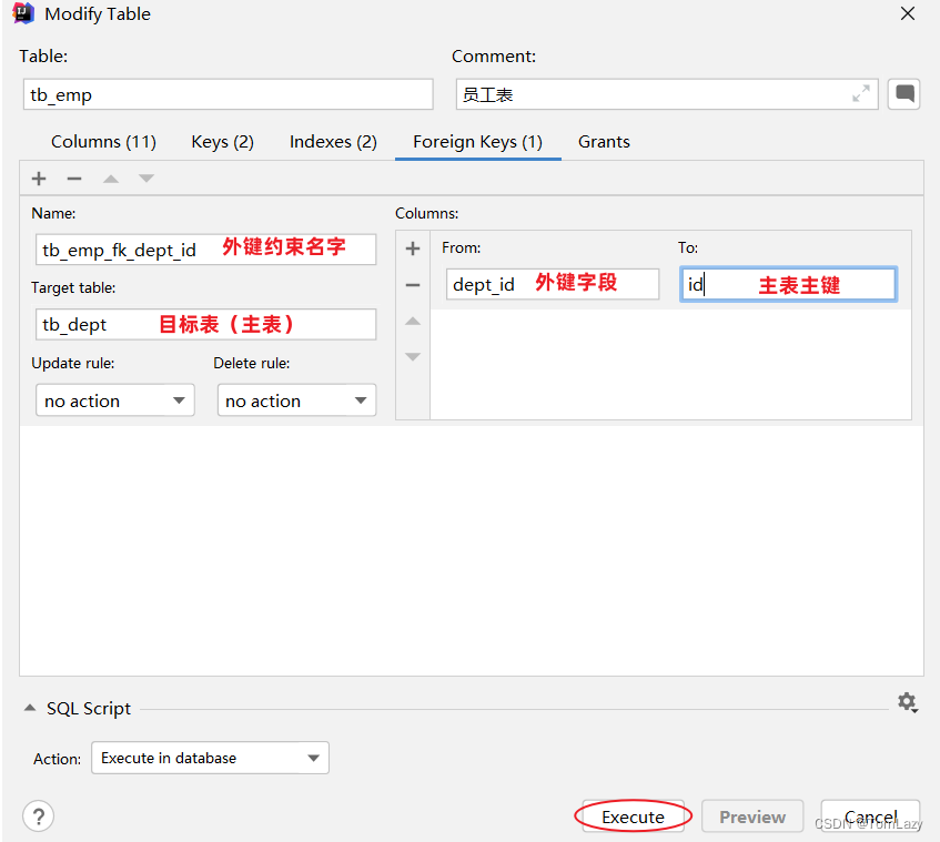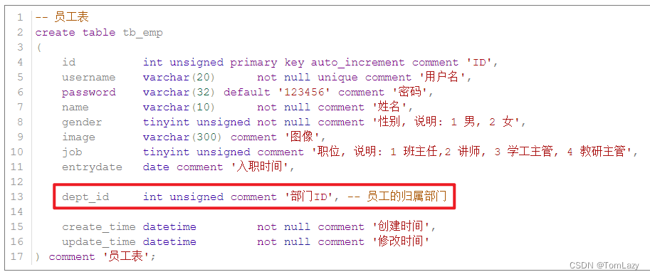 部门表创建好之后,我们还需要再修改下员工表。为什么要修改员工表呢?是因为我们之前设计员工表(单表)的时候,并没有考虑员工的归属部门